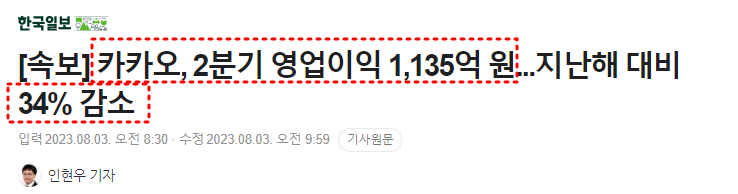 카카오, 2분기 영업이익 1,135억 원...지난해 대비 34% 감소