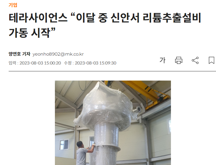 테라사이언스 “이달 중 신안서 리튬추출설비 가동 시작”