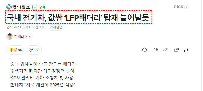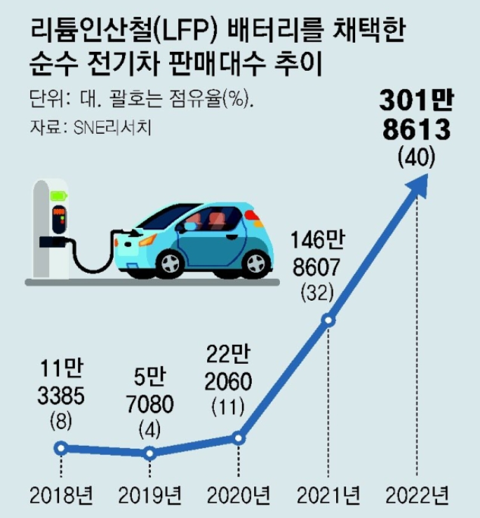 국내에서 판매되는 전기 승용차에 중국 업체들이 주로 만드는 리튬인산철(LFP) 배터리를 사용한 모델이 늘고 있다. 국내 자동차·배터리 업체들도 상대적으로 가격이 저렴한 LFP 배터리 개발에 뛰어들며 향후 본격적인 전기차 가격 경쟁을 예고했다.