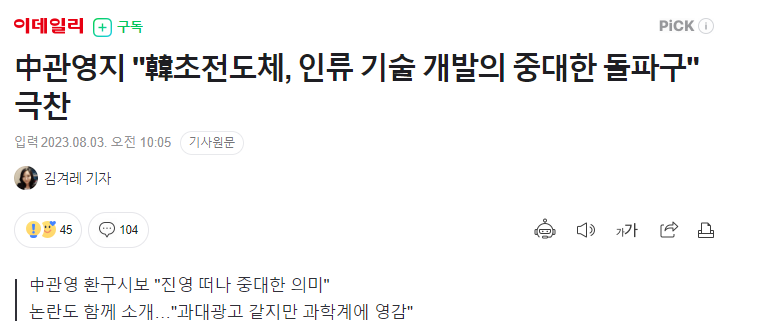 한국 연구진이 상온·상압 초전도체(LK-99)를 개발했다는 논문을 발표하자 중국 관영 언론이 “동맹과 진영을 떠나 인류 과학 기술의 돌파구”라고 극찬했다.