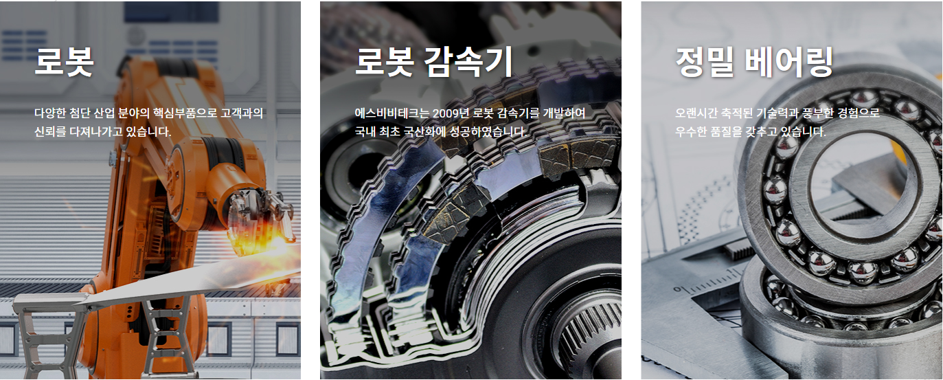 에스비비테크(SBB)는 특수 환경용 베어링 및 반도체 장비 구동 부품 제조 업체이다. 동사는 기존 초박형 베어링 부품 사업을 기반으로 로봇용 정밀 감속기를 제작 설계하기 위한 초소형 크기의 정밀 가공, 독자 치형설계, 소재·열처리 기술 등 핵심 원천기술을 모두 확보하고 있다.