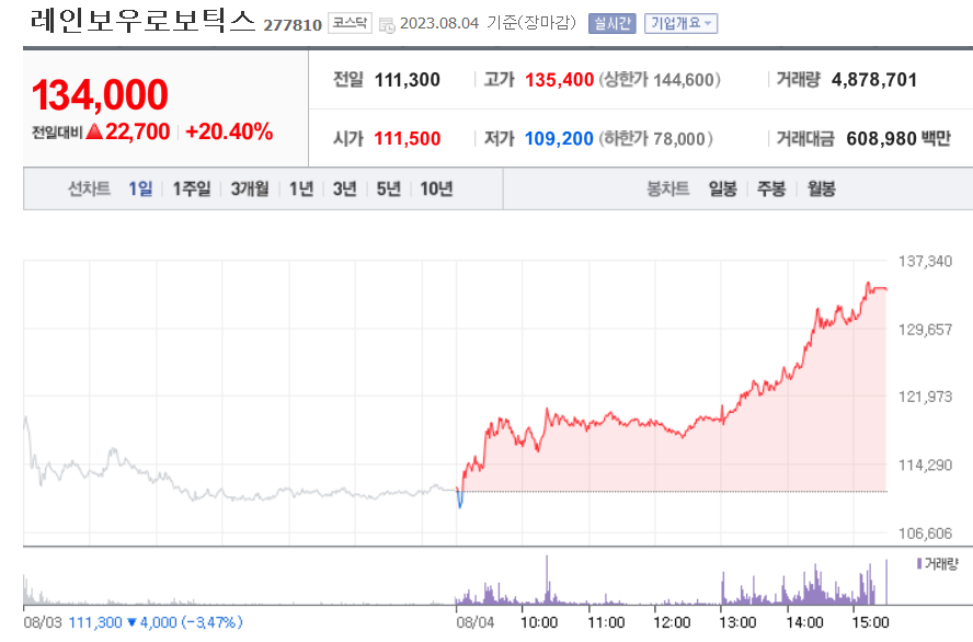 삼성이 투자하고 정부가 밀고 있는 로봇섹터에 대한 기대감이 벌써부터 핫한 가운데, 작일(4일) 레인보우로보틱스는 20% 가까이 상승했다.
