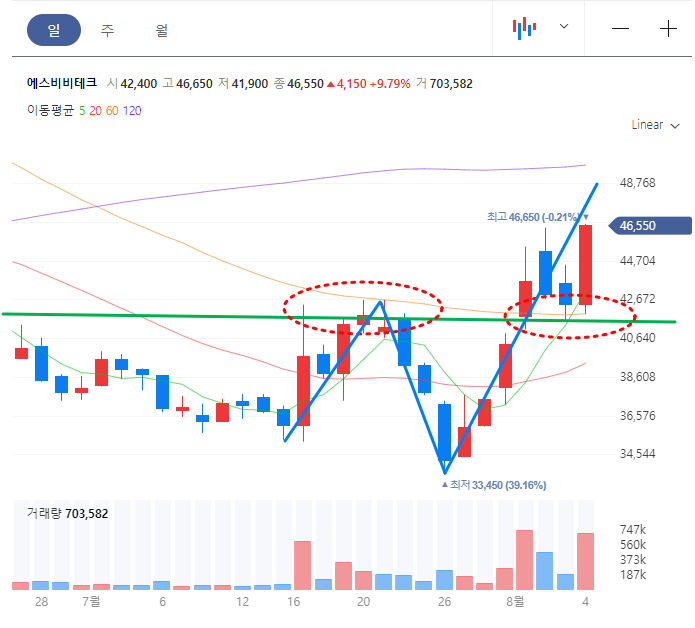 7월17일에 힘차게 일봉 20선을 돌파하는 모습을 보였고, 7월 20일 및 21일에 일봉 60선 저항대에 막혀 하락하는 양상을 보였지만 다시금 상승세를 보여줬다. 이전에 돌파하지 못 했던 60선 저항대를 8월1일에 갭 상승하면서 돌파하였고 지난 금요일(8/4)까지 여전히 일봉 60선 위에서 주가가 형성되고 있다.