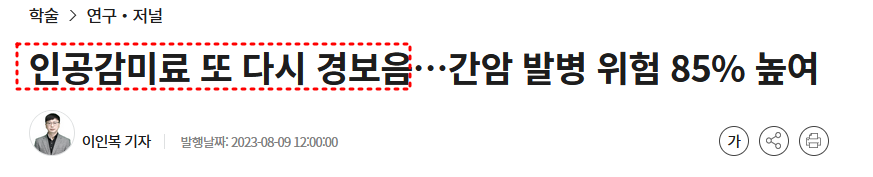 현지시각으로 8일 미국의사협회지(JAMA)에는 인공감미료 섭취가 간암 및 만성 간질환에 미치는 영향에 대한 대규모 연구 결과가 게재됐다(10.1001/jama.2023.12618). 최근 세계보건기구(WHO)가 아스파탐을 발암 물질로 지정하면서 인공감미료 등이 인체에 미치는 영향에 대한 관심이 높아진 상태다.