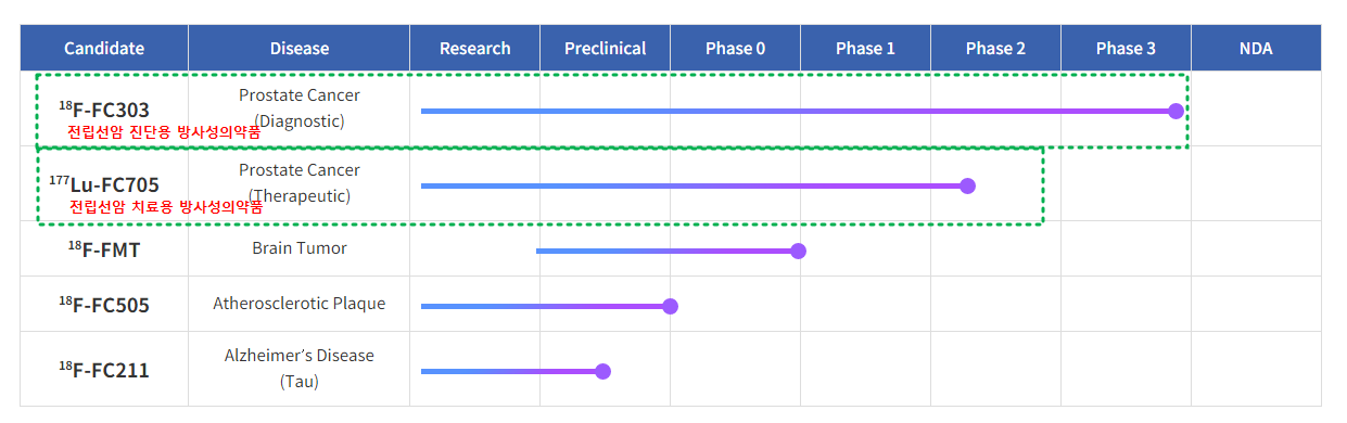 현재 퓨쳐켐의 FC303(전립선암 진단용 방사성의약품)의 경우 3상 진행 중에 있고, FC705(전립선암 치료용 방사성의약품)는 2상 진행 중이다.
