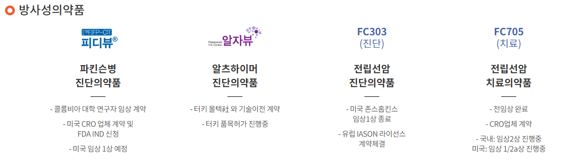 대표적인 제품으로는 파킨슨 진단용 방사성의약품 피디, 알츠하이머 진단용 방사성의약품 알자뷰, 전립선암 진단용 방사성의약품 FC303 그리고 전립선암 치료용 방사성의약품 FC705 등이 있다.