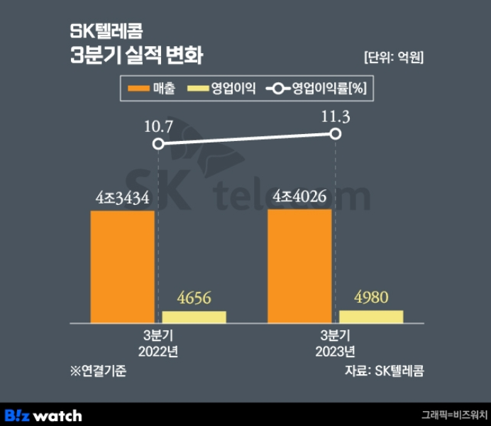 SK텔레콤은 연결 기준 지난 3분기 영업이익이 4980억원으로 전년동기대비 7% 증가했다고 8일 밝혔다. 같은 기간 매출은 1.4% 늘어난 4조4026억원, 당기순이익은 25.5% 증가한 3082억원으로 집계됐다.