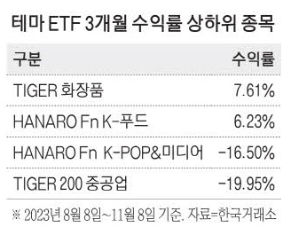 K푸드와 K뷰티의 세계적 흥행으로 주요 소비재 관련 상장지수펀드(ETF)가 지난 3개월간 테마 ETF 수익률 상위권에 이름을 올렸다. 반면 같은 기간 중후장대주와 엔터주에 투자하는 ETF는 코스피 하락률을 크게 웃돌며 부진했다.