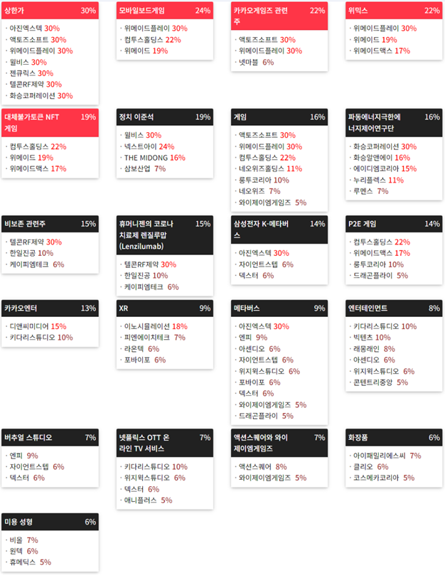 모바일게임(스마트폰), 게임, 웹툰, 홈쇼핑, 미용기기, 영화, NFT(대체불가토큰), 영상콘텐츠, 가상화폐(비트코인 등), 증강현실(AR), 희귀금속(희토류 등), 메타버스(Metaverse), 마리화나(대마), 여행, 백신/진단시약/방역(신종플루, AI 등), 엔터테인먼트, 가상현실(VR), 제지, 보톡스(보툴리눔톡신), 마이크로 LED, 제약업체 등...