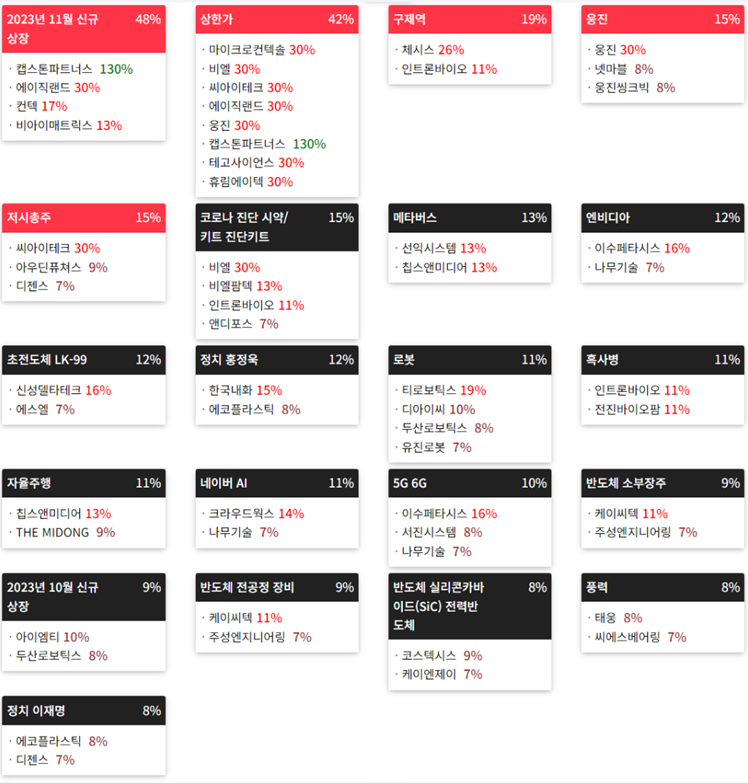 창투사, LED장비, HBM(고대역폭메모리), 키오스크(KIOSK), 조선, 로봇(산업용/협동로봇 등), 인터넷 대표주, DMZ 평화공원, 3D 낸드(NAND), 시스템반도체, 반도체 재료/부품, 슈퍼박테리아, 반도체 장비, 치아 치료(임플란트 등), 카지노, 우주항 공산업(누리호/인공위성 등), 자동차 대표주, 초전도체, 건설 대표주, AI 챗봇(챗GPT 등), 석유화학, IT 대표주, 2차전지 등...