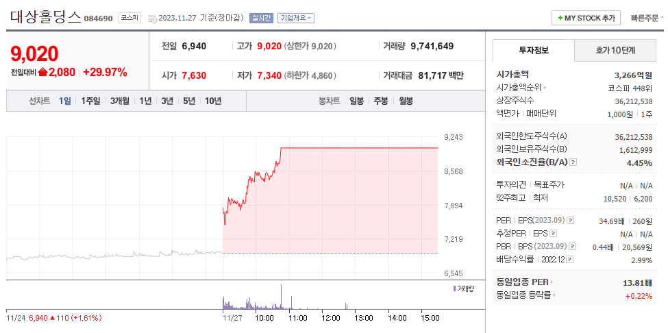4. 대상홀딩스(29.97%) : 한동훈 법무부 장관 출마 기대감 지속 속 관련주로 시장에서 부각되며 상한가