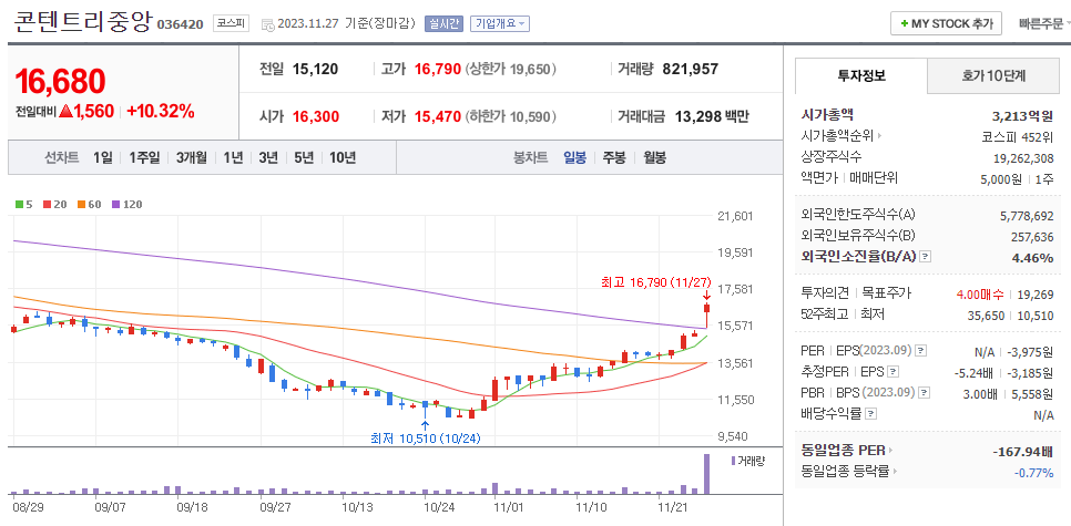 23.11.27(월) 종가기준 콘텐트리중앙 등락률 /출처: 네이버증권