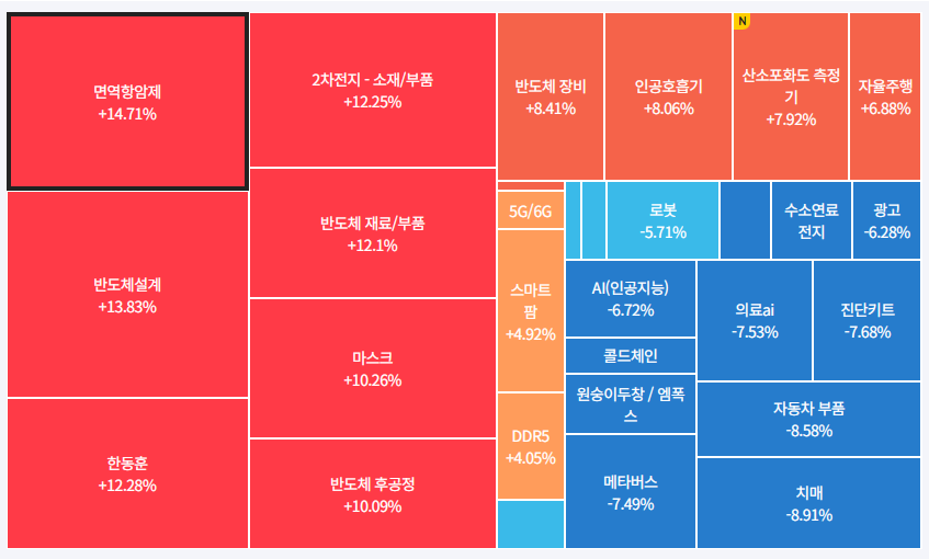 시스템반도체, 반도체 대표주(생산), 터치패널(스마트폰/태블릿PC 등), 화이자(PFIZER), 제지, 조선, 마스크, 면역항암제, LED장비, 3D 낸드(NAND), 건강기능식품, HBM(고대역폭메모리), 종합상사, 애플페이, 해운, 반도체 재료/부품, 영화, 양자 암호, 전력설비, IT 대표주, 모바일게임(스마트폰), 가상화폐(비트코인 등), 국내 상장 중국기업, 게임, NFT(대체불가토큰), 전자결제(전자화폐) 등...