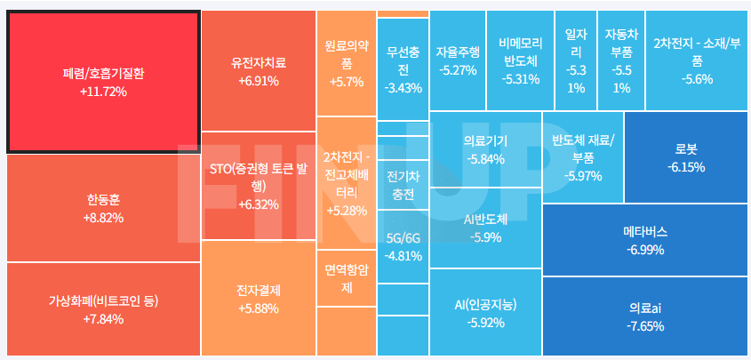 | 약세 테마 | 요소수, 키오스크(KIOSK), 애플페이, 맥신(MXene), 화폐/금융자동화기기(디지털화폐 등), 일자리(취업), 해운, 양자암호, 로봇(산업용/협동로봇 등), 의료기기, 희귀금속(희토류 등), 면세점, 그래핀, 지능형로봇/인공지능(AI), 조선기자재, 종합 물류, 4대강 복원, 가상현실(VR), 무선충전기술, 페라이트, 온디바이스 AI, 비료, 드론(Drone), 스마트팩토리(스마트공장) 등... |