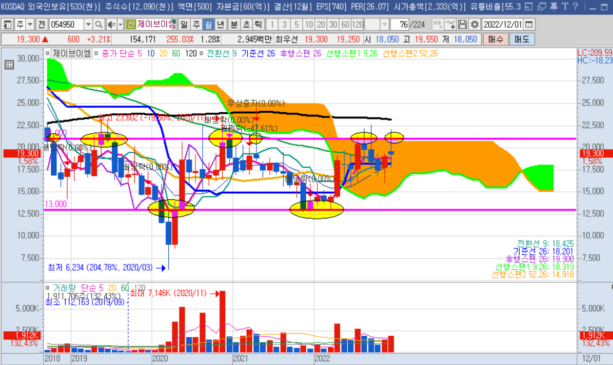 우선 제이브이엠 월봉차트를 보면, 하단 지지선은 13,000원대이며, 상단 저항선은 21,000원대로 관찰 된다. 구름대 매물을 소화중에 있으며, 일목균형표 기준선을 이탈하지 않고, 상단 저항선을 돌파하려고 준비 및 매집 중에 있다. 전년도에 비해 영업이익이 2배 가까이 증가하였지만, 아직 박스권 상단을 돌파하지 못 했기에 조만간 이 실적 및 향후 시장점유율 향상에 따른 기대감이 주가 상승 모멘텀을 키울 수 있을 것으로 보인다.