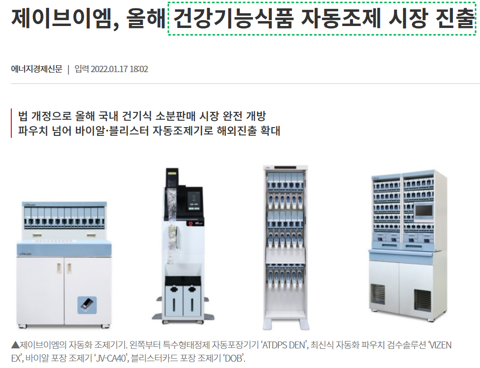 한국건강기능식품협회에 따르면, 지난해 국내 건강기능식품 시장은 5조454억원 규모로, 오는 2030년 25조원까지 성장할 전망이다. 제이브이엠(JVM)은올해부터 시행되는 건강기능식품 소분판매 제도에 발맞춰 건기식 자동조제 분야에 진출하는 동시에, 바이알·블리스터 방식 자동조제 등 글로벌 의약품 재포장 시장 공략을 확대할 계획이라고 올해 초에 밝혔다. 여전히 기대감이 유효하며 이 시장까지 진입한다면 추가적인 매출이 발생하여 주가상승 모멘텀에 크게 기여할 것으로 보인다.