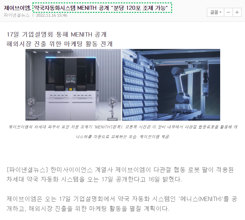 기사에 따르면, 세계 약국 자동화 시스템 시장 규모는 현재 약 3조원 안팎이다. 글로벌 시장조사업체 ‘폴라리스 마켓 리서치’에 따르면 해당 시장은 2028년경 98억3000만 달러(한화 약 12조9400억원)에 이를 것으로 분석됐다. 커지는 시장에 파이를 키워가는 제이브이엠(JVM)의 활약에 따른 기대감이 주가에 반영 할 것으로 보인다.