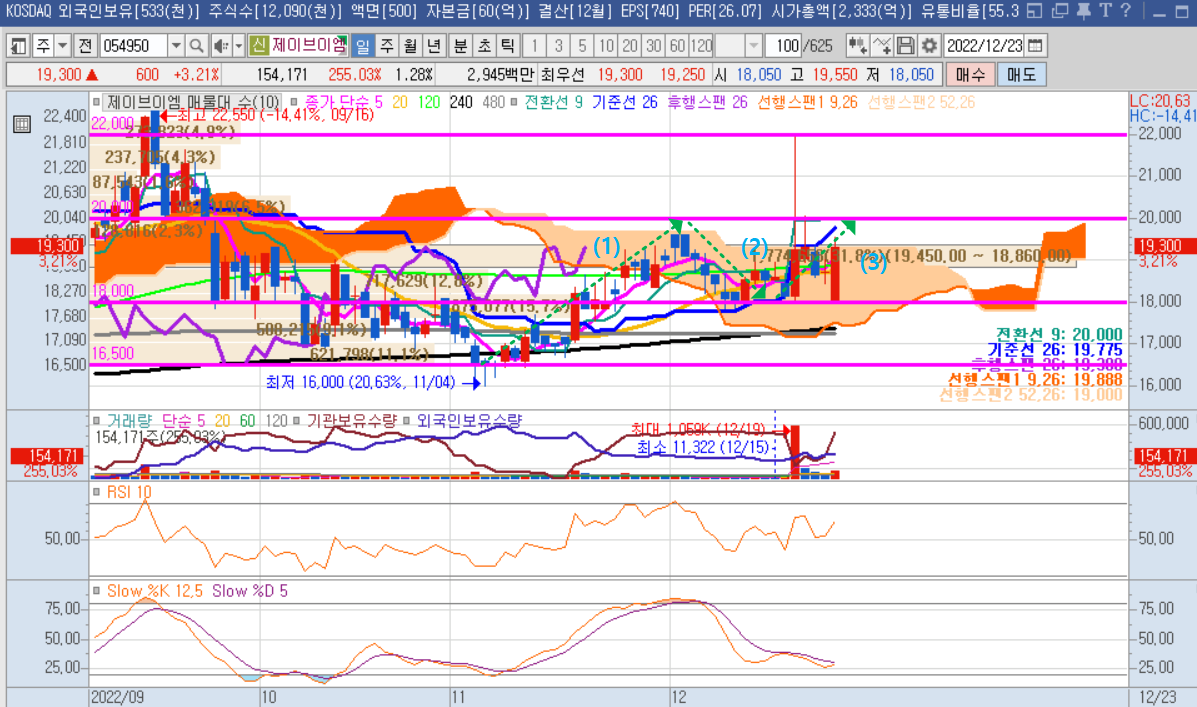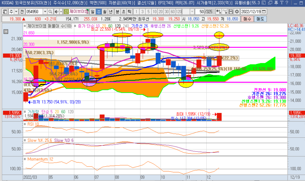 다음으로 제이브이엠 주봉차트를 보면 16,200원대에서 강력한 지지를 해주고 있는 상황이며, 주봉 60선을 이탈하지 않고 있는 흐름이다. 최근 주봉 240선 및 120선 위로 올라왔고, 20선 돌파를 준비중에 있다. 지난주 큰 상승돌파로 20선을 돌파하는 양상을 보였지만 20,300원대의 저항선을 맞고 현재 일목균형표 기준선 및 20선 근처에서 맴돌고 있다. 보조지표 모멘텀을 보면 100이상으로 올라왔기에 상승 모멘텀 추세에 있고 Stochastic slow 지표를 보면 K가 하단에서 상승추세로 전환하는 과정에 있다. 이는 보통 하단에서 상승으로 나아가는 초입 구간이라 볼 수 있다.