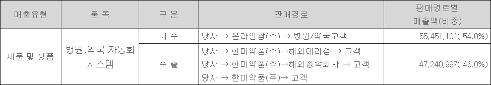 국내의 경우는 한미사이언스(주)의 자회사인 온라인팜(주)를 통해 병원 및 약국의 영업을 하고 있으며, 해외의 경우 한미약품(주)을 통해 북미는 전략적 독점 및 비독점 대리점 체제, 유럽은 자회사를 통한 판매 방식, 중국은 시노팜을 통한 독점적 대리점 체제 영업을 하고 있다.