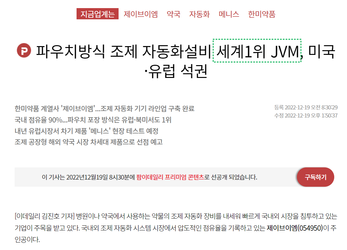 한미약품 그룹소속인 제이브이엠(JVM)은 뛰어난 기술력과 한미약품의 우수한 해외 네트워크를 앞세워 국내 뿐만아니라 해외에서도 압도적인 점유율을 기록하고 있다. 인력 난을 해결하면서 동시에 인건비 부담을 덜기위한 대형약국과 중소형 약국들은 제이브이엠(JVM)의 조제 자동화 시스템 매력에 빠져있다. 최근 북미와 유럽(스웨덴, 네덜란드, 독일, 프랑스) 등에 위치한 여러 국가에서 아시아 지역에서 주로 써온 파우치형 조제 방식을 권고하기 시작되었는데, 파우치형 자동 조제 시스템을 보유한 제이브이엠(JVM)의 매출 확대가 가속화될 전망이다. 제이브이엠(JVM)에 따르면 회사는 현시점에서 일본을 제외한 한국과 유럽, 미국 등의 파우치형 조제 자동화 시스템 시장 점유율 1위를 차지하고 있다고한다.