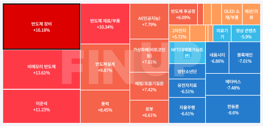 강세 테마 | 온디바이스 AI, 시스템반도체, 반도체 재료/부품, 반도체 장비, 항공/저가 항공사(LCC), HBM(고대역폭메모리), 풍력에너지, 전기차, 주류업(주정, 에탄올 등), 건설 대표주, 조선, 쿠팡(coupang), 제대혈, 반도체 대표주(생산), 화학섬유, PCB(FPCB 등), 해저터널(지하화/지하도로 등), 교육/온라인 교육, 지능형로봇/인공지능(AI) 등... |