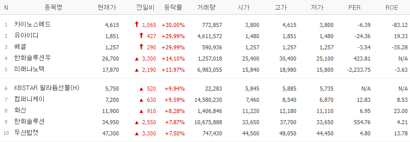 | 종목명 | 등락률(%) | 특이사항 |
