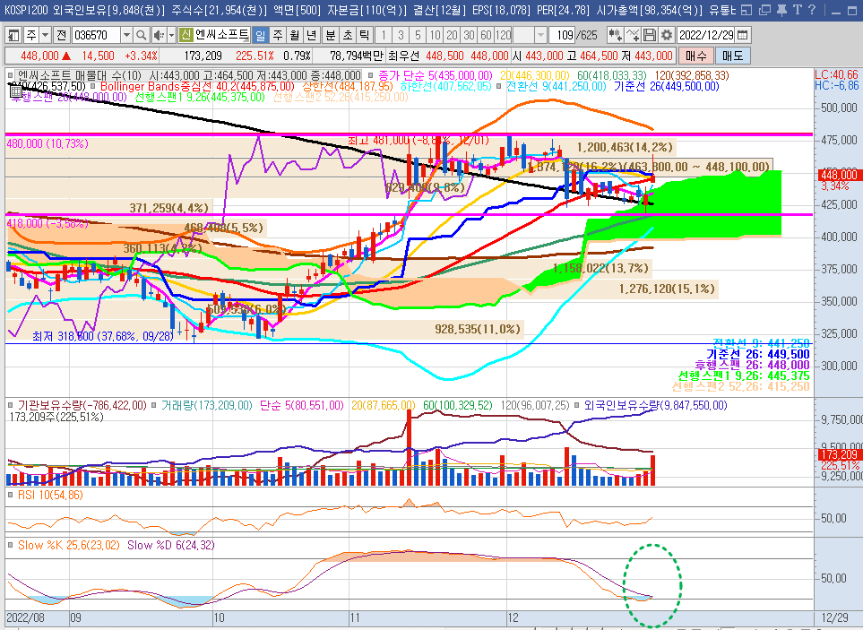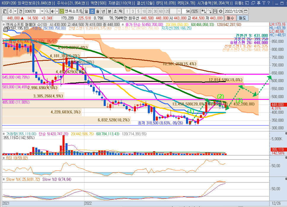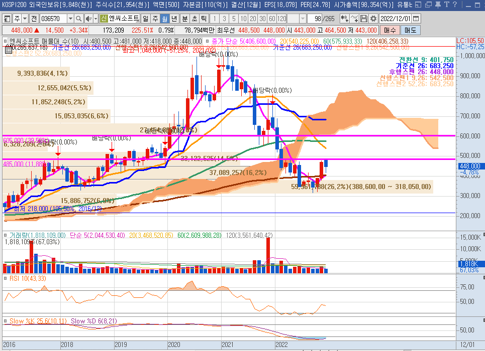 우선 엔씨소프트 월봉차트를 보면, 21년도 실적이 20년도 보다 상당히 저조하여 주가가 곤두박질 치다가 22년도 실적이 21년도보다는 크게 증가하여 월봉 120선부근에서 지지받고 올라섰으며 최근 저항선은 485,000원대로 관찰 된다. 월봉상의 Stocastic slow 는 하단구간에 있어 분할매수해도 부담가지 않는 구간이다. 다음 2차 저항은 605,000원대 정도 이며 60만원 초반대까지의 매물대는 두텁지 않기에 2차 저항대까지는 무난히 도달 할 것으로 보인다.