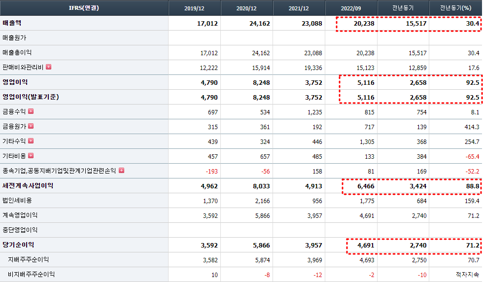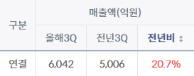 엔씨소프트의 22년 3분기 매출액은 전년 동기 대비 20.7% 증가하였다.