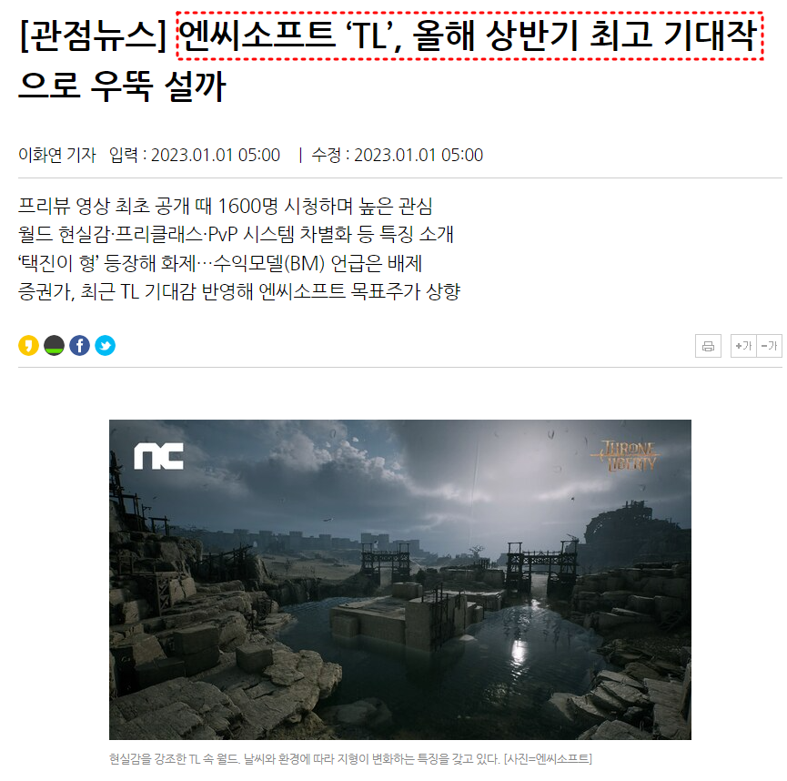 올해 신규 기대작인 TL은 PC와 콘솔 각 디바이스에 맞는 사용자 경험(UX)과 사용자 환경(UI)을 제공하고 글로벌 이용자의 다양한 취향을 고려한 캐릭터 커스터마이징 기능을 구현할 것이므로 많은 유저확보에 따른 수익화구조에 관심이 쏠린다. 업계에서 TL에 주목하는 이유는 리니지W 이후 신작 공백이 이어졌던 엔씨소프트의 첫 콘솔 게임 도전작이자, 블레이드앤소울 이후 10년 만에 선보이는 PC 게임이기 때문이다. 콘솔과 PC가 서로 연동되는 크로스플랫폼으로 북미시장을 개척할 수 있을지 관심이 모아진다. 여의도에선 디아블로4와 TL의 출시 시기가 겹쳐 경쟁 구도를 그릴 것이라는 관측도 내놓는다.
