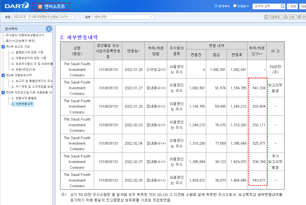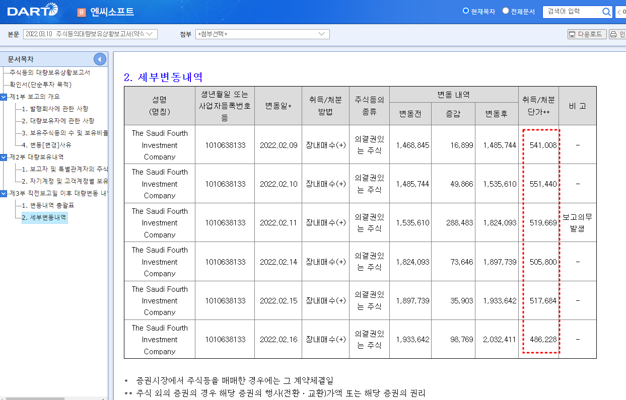 22년 1월에서 2월 한창 엔씨소프트의 주가가 곤두박질 치던시절 사우디 투자자 The Saudi Fourth Investment Company는 장내매수를 하며 엔씨소프트의 지분을 늘려갔으며 당시 평균취득단가는 위와 같이 50만원대라는 것을 볼 수 있다. 현재 엔씨소프트의 주가는 448,000원(22.12.29 기준) 이므로 사우디 투자자가 최근에 장내매수한 가격보다 더 저렴하게 매수할 수 있는 절호의 찬스이다.