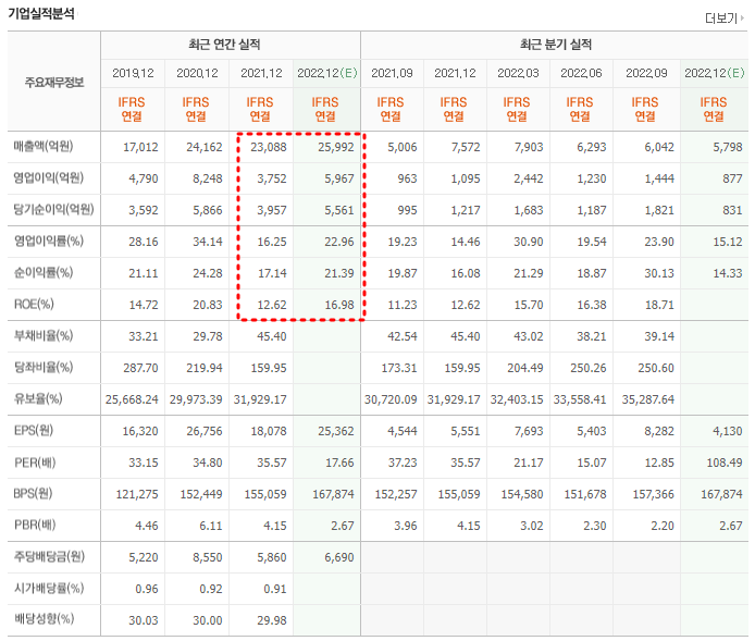 엔씨소프트의 22년도 실적은 21년도 대비 전반적으로 향상될 것으로 보인다. 22년 4분기 매출은 저조할 것으로 예측되지만, 영업이익과 당기순이익은 다시 5천억원대 이상으로 상승, 영업이익 및 순이익률은 20%이상, ROE도 15%이상으로 상향 전망한다.