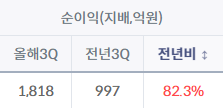 엔씨소프트의 22년 3분기 순이익은 전년 동기 대비 82.3% 증가하였다.