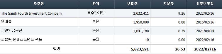 참고로 5%이상 지분보유의 대주주는 하기와 같다.
