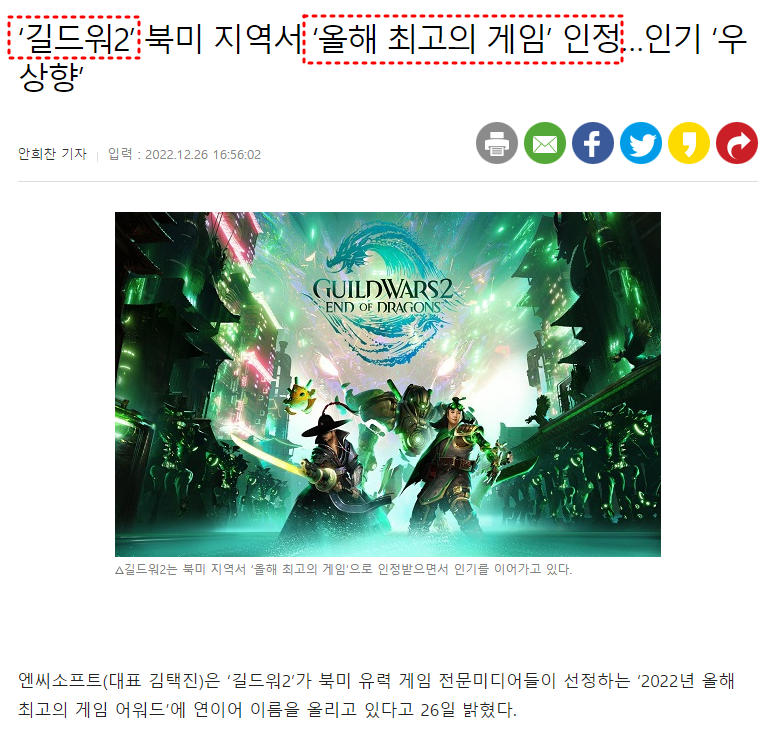 그에 반면 엔씨소프트의 ‘길드워2’ 가 북미 지역서 '22년도 올해 최고의 게임'으로 인정받고 있고 인기가 높아지면서 해외 매출 성장이 더욱 기대되는 전망도 있다. 참고로 길드워2는 엔씨 북미 스튜디오 아레나넷이 개발해 올해 서비스 10주년을 맞이한 대표적인 장수 MMORPG로, 글로벌 IP로서 존재감을 공고히 하고 있다. 올해 초 세 번째 확장팩 '엔드오브드래곤즈'를 출시하고 글로벌 게임 플랫폼 '스팀' 서비스를 시작하는 등 지속적인 서비스 확장 중에 있다.