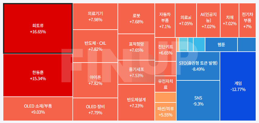 | 약세 테마 | STO(증권형 토큰 발행), NFT(대체불가토큰), 전선, 육계, 웹툰, 리튬, 광고, 4대강 복원, 남-북-러 가스관사업, 교육/온라인 교육, 모바일콘텐츠(스마트폰/태블릿PC), 태풍 및 장마, 토스(toss), 조림사업, 아스콘(아스팔트 콘크리트), 가상화폐( 비트코인 등), 전력설비, 빈대, 캐릭터상품, mRNA(메신저 리보핵산) 등... |