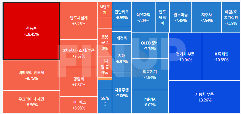 | 약세 테마 | 해운, 리튬, 2차전지(전고체), 두나무(Dunamu), LED장비, 탄소나노튜브(CNT), 리비안(RIVIAN), MLCC(적층세라믹콘덴서), 2차전지(LFP/리튬인산철), 희귀금속(희토류 등), 페라이트, 피팅(관이음쇠)/밸브, 터치패널(스마트폰/태블릿PC 등), HBM(고대역폭메모리), 음원/음반, 2차전지(장비), 엔터테인먼트, 마켓컬리(kurly), 쿠팡(coupang), 온실가스(탄소배출권), 창투사, 웹툰, 반도체 장비 등... |