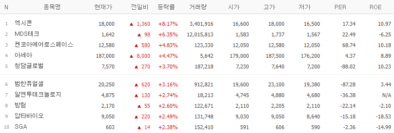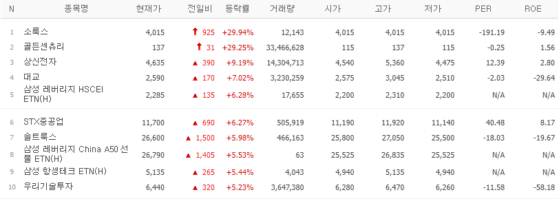 | 종목명 | 등락률(%) | 특이사항 |