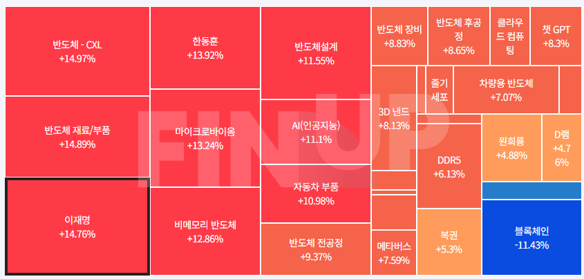 | 강세 테마 | CXL(컴퓨트익스프레스링크), 국내 상장 중국기업, 반도체 재료/부품, 온디바이스 AI, 항공기부품, 마이크로바이옴, PCB(FPCB 등), 드론(Drone), 조림사업, 3D 낸드(NAND), 인터넷 대표주, 시스템반도체, HBM(고대역폭메모리), 반도체 장비, 우주항공산업(누리호/인공위성 등), 치아 치료(임플란트 등), 그래핀, 항공/저가 항공사(LCC), 재난/안전(지진 등) 등... |