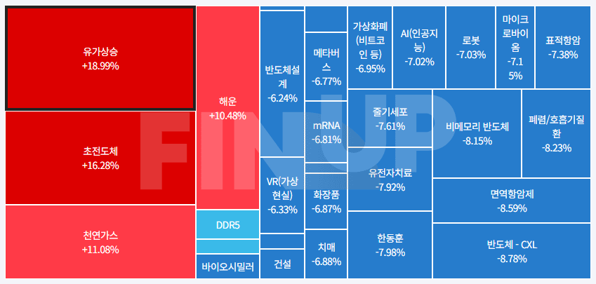 | 강세 테마 | 초전도체, 해운, LPG(액화석유가스), 윤활유, 도시가스, 핵융합에너지, CCTV&DVR, 화학섬유, 정유, 인터넷 대표주, 보안주(물리), 카메라모듈/부품, 자원개발, 여행, 사료, 백화점, 우주항공산업(누리호/인공위성 등), 리츠(REITs), 종합 물류, 2차전지, 셰일가스(Shale Gas), 건설 대표주, 화폐/금융자동화기기(디지털화폐 등), 온실가스(탄소배출권) 등... |