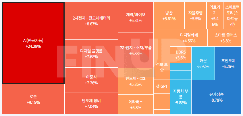 | 약세 테마 | 해운, 자전거, LPG(액화석유가스), 도시가스, 초전도체, 아스콘(아스팔트 콘크리트), 윤활유, 온디바이스 AI, 핵융합에너지, 겨울, 국내 상장 중국기업, 3D 낸드(NAND), 제대혈, 시스템반도체, HBM(고대역폭메모리), 야놀자(Yanolja), 면역항암제, 전기자전거, LED장비, 인터넷 대표주, 우주항공산업(누리호/인공위성 등), 반도체 재료/부품, 반도체 장비 등... |