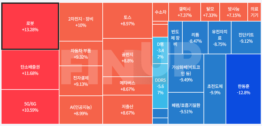 | 약세 테마 | 초전도체, SNS(소셜네트워크서비스), CXL(컴퓨트익스프레스링크), 국내 상장 중국기업, NFT(대체불가토큰), 시스템반도체, 3D 낸드(NAND), 리튬, 바이오인식(생체인식), 의료AI, 가상화폐(비트코인 등), HBM(고대역폭메모리), 반도체 재료/부품, 온디바이스AI, 플렉서블 디스플레이, 2차전지, 아이폰, 2차전지(전고체), 카메라모듈/부품, mRNA(메신저 리보핵산), 반도체 장비 등... |