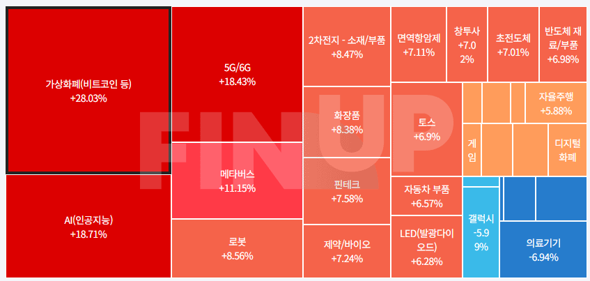 | 강세 테마 | 두나무(Dunamu), 가상화폐(비트코인 등), 야놀자(Yanolja), 토스(toss), 창투사, 일자리(취업), 통신장비, 제4이동통신, 테마파크, STO(토큰증권 발행), 전자결제(전자화폐), 5G(5세대 이동통신), 화폐/금융자동화기기(디지털화폐 등), NFT(대체불가토큰), 증권, 양자암호, 카카오뱅크(kakao BANK), 인터넷 대표주, SNS(소셜네트워크서비스), 블록체인, 맥신(MXene), 폐기물처리, 은행, 애플페이, 음원/음반 등... |