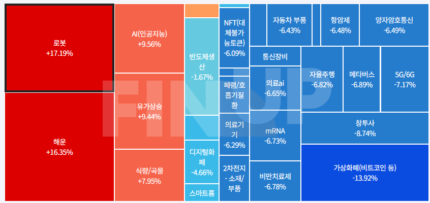| 약세 테마 | 가상화폐(비트코인 등), 두나무(Dunamu), 야놀자(Yanolja), 토스(toss), 일자리(취업), 폐기물처리, NFT(대체불가토큰), 창투사, 의료AI, 전자결제(전자화폐), STO(토큰증권 발행), 마이코플라스마폐렴, 화폐/금융자동화기기(디지털화폐 등), 음원/음반, mRNA(메신저 리보핵산), 핀테크(FinTech), 마리화나(대마), 마이데이터, 출산장려정책, 면역항암제, 초전도체, 모바일게임(스마트폰), 바이오인식(생체인식) 등... |