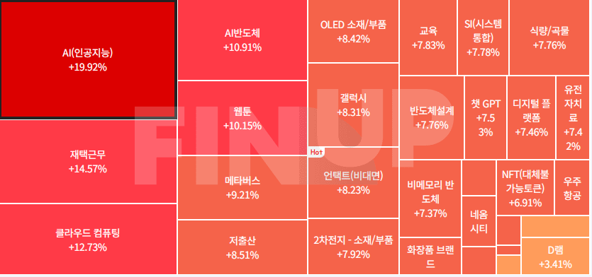 | 강세 테마 | 출산장려정책, AI 챗봇(챗GPT 등), 웹툰, 일자리(취업), 재택근무/스마트워크, 엔젤산업,교육/온라인 교육, CXL(컴퓨트익스프레스링크), 모바일콘텐츠(스마트폰/태블릿PC), 항공/저가 항공사(LCC), 테마파크, 마리화나(대마), 빈대, 전선, 비료, 온디바이스 AI, 마스크, 캐릭터상품, HBM(고대역폭메모리), 제지, 지능형로봇/인공지능(AI), 전력설비, 토스(toss), 화장품, 게임 등... |