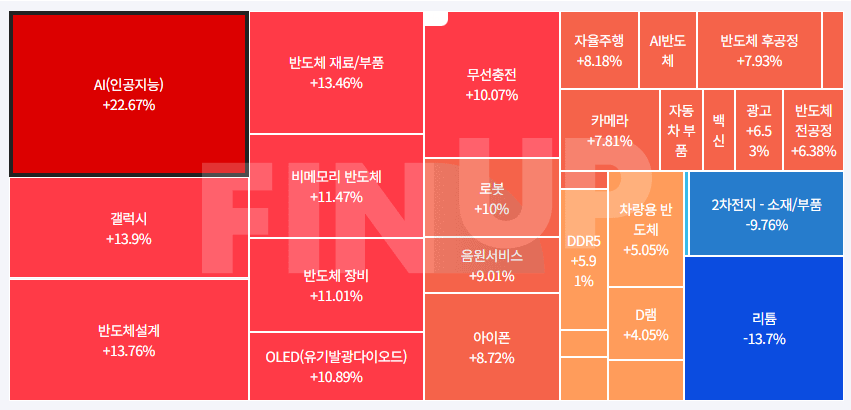 | 강세 테마 | 온디바이스 AI, HBM(고대역폭메모리), 시스템반도체, 반도체 장비, CXL(컴퓨트익스프레스링크), 반도체 재료/부품, LED장비, 아이폰, 조선, 3D 낸드(NAND), 무선충전기술, 반도체 대표주(생산), PCB(FPCB 등), 폴더블폰, 휴대폰부품, 갤럭시 부품 주, 일자리(취업), 음원/음반, 카메라모듈/부품, 자율주행차, 스마트폰 등... |
