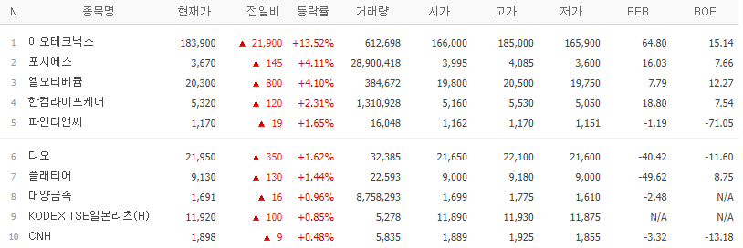 갭상승 종목중에서 전일 고가보다 당일 저가가 높은 종목 Top 10 (24.01.19(금) 종가기준)