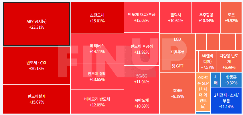 | 강세 테마 | CXL(컴퓨트익스프레스링크), 초전도체, 밥솥, 시스템반도체, HBM(고대역폭메모리), 보안주(물리), 렌터카, 바이오인식(생체인식), 온디바이스 AI, 홈쇼핑, AI 챗봇(챗GPT 등), 카메라모듈/부품, 반도체 장비, 갤럭시 부품주, 마켓컬리(kurly), 반 도체 재료/부품, 우주항공산업(누리호/인공위성 등), 3D 낸드(NAND), 양자암호, 창투사, PCB(FPCB 등) 등... |