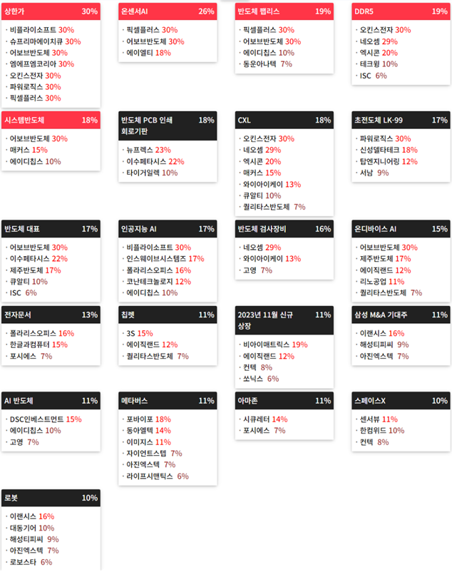 1. 픽셀플러스(30%) : 삼성전자·SK하이닉스, 온센서AI 기술 상용화 기대감 속 관련주로 부각되며 상한가