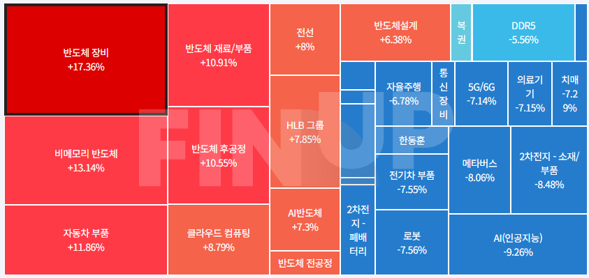 | 강세 테마 | 창투사, 국내 상장 중국기업, 전선, 마이크로 LED, 자동차 대표주, 렌터카, 온디바이스 AI, 화학섬유, 시스템반도체, 밥솥, 3D 낸드(NAND), 농업, 타이어, 화이자(PFIZER), 홈쇼핑, 건설 대표주, 반도체 장비, HBM(고대역폭메모리),손해보험, 통 신, 플렉서블 디스플레이, 은행, 전력설비, 조선 등... |