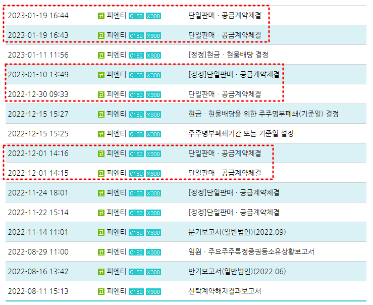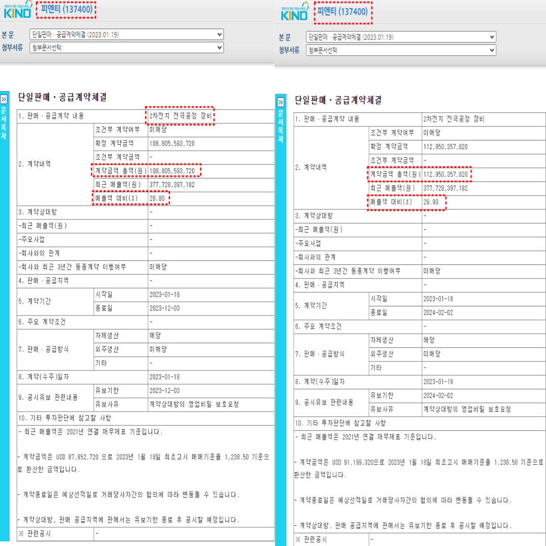 또한 23년 1월 19일 추가적인 단일판매 및 공급계약 체결관련 공시가 올라왔는데 그 금액은 최근 매출액 대비 종합 58.7%(=28.80%+29.90%) 정도이다.
